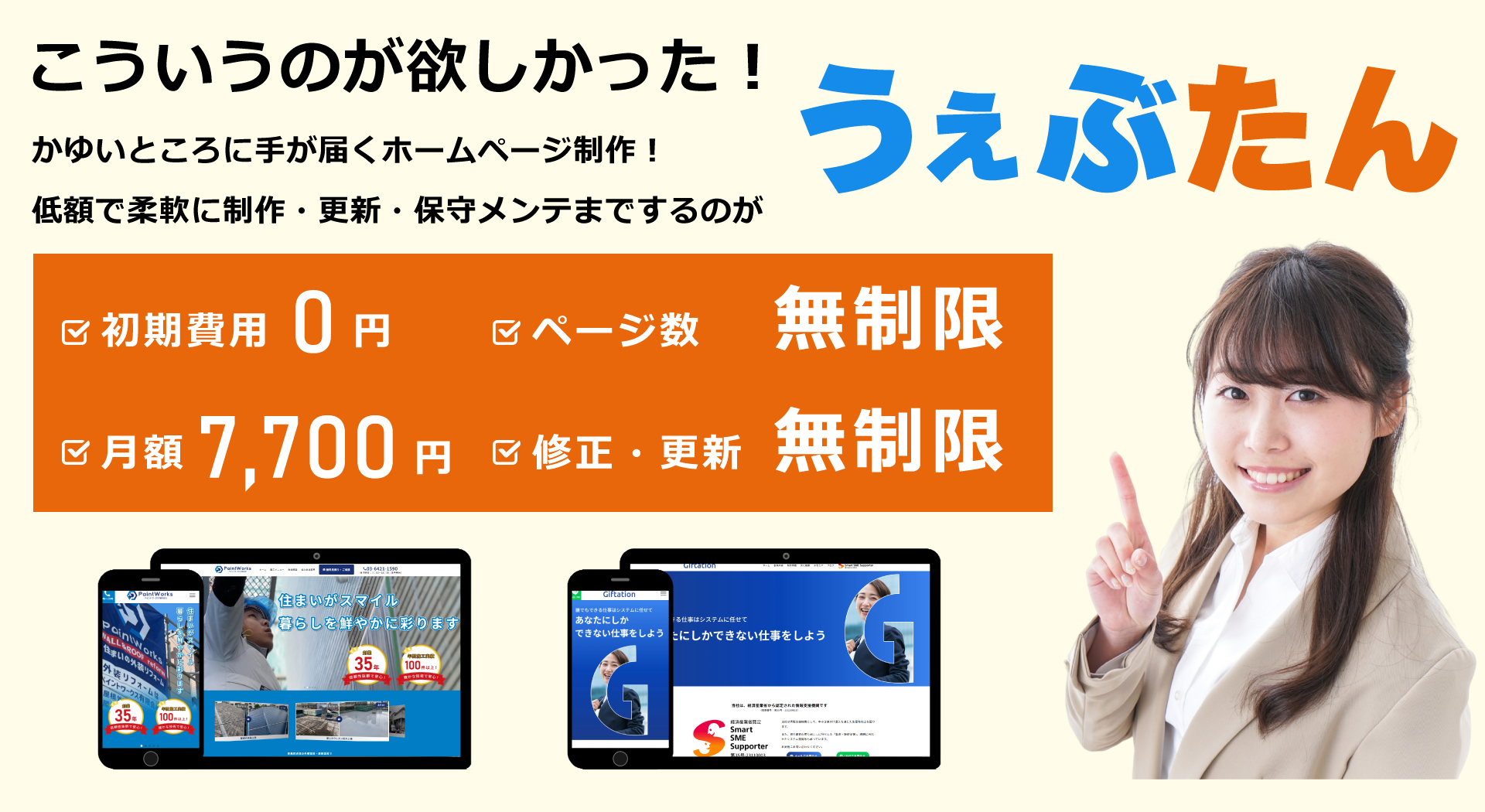 そのためうぇぶたんは、お客様に気軽にホームページの修正・追加・更新をしていただけるよう、これらの作業についても無料で代行いたします。